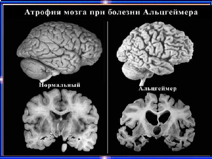 • Аурудың клиникалық көрінісін 1906 жылы неміс психиатры Алоис Альцгеймер сипаттап айтқан. • Клиникалық диагнозды КТ, МРТ нәтіжелеріне сүйене отырып қоямыз (расширение желудочковой системы, истончение коркового вещества). • Бұзылыстың этиологиясы анық емес. • Аурудың патогенезінде басты ролды амилоидтардың жиналуы (сенильные бляшки, отложение в стенке сосудов) және мидың холинергиялық қызметіні функциясының төмендеуі атқарады. • Емінде холинэстераза ингибиторлары: амиридин, галантамин, ривастигмин, донепезил қолданылады. Бұл ем аурудың алғашқы сатыларында ғана көмектеседі. • Аурудың орташа ұзақтығы 8 жылға созылады.