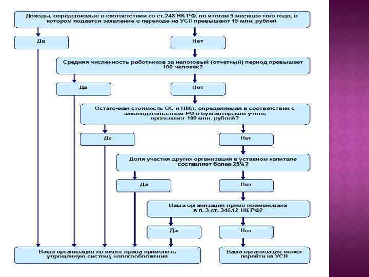 o Организация имеет право перейти на УСНО, если по итогам 9 месяцев того года, в котором организация подает заявление о переходе на УСНО доходы не превысили 45 млн. руб.