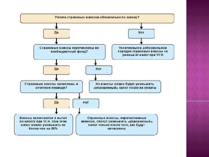 По итогам каждого отчетного периода исчисляется сумма авансового платежа по налогу. § Налогоплательщик, выбравший в качестве объекта налогообложения доходы исчисляет сумму авансового платежа по налогу, исходя из ставки налога и фактически полученных доходов, рассчитанных нарастающим итогом с начала налогового периода до окончания соответственно первого квартала, полугодия, 9 месяцев с учетом ранее исчисленных сумм авансовых платежей. § Сумма авансовых платежей уменьшается на сумму страховых взносов на обязательное пенсионное страхование, социальное страхование, медицинское страхование. При этом сумма авансовых платежей не может быть уменьшена более чем на 50% Налогоплательщики, выбравшие в качестве объекта налогообложения доходы, уменьшенные на величину расходов исчисляют сумму авансового платежа по налогу, исходя из ставки налога и фактически полученных доходов, уменьшенных на величину расходов. Уплата налога и авансовых платежей производится единым платежом с последующим распределением по бюджетам органами федерального казначейства. Уплата налога организациями и ИП осуществляется: 25 апреля 25 июля 25 октября По итогам налогового периода не позднее 31 марта. (организации) По итогам налогового периода не позднее 30 апреля. (ИП) Представление налоговой декларации осуществляется только по итогам налогового периода не позднее 31 марта (30 апреля) следующего налогового периода.