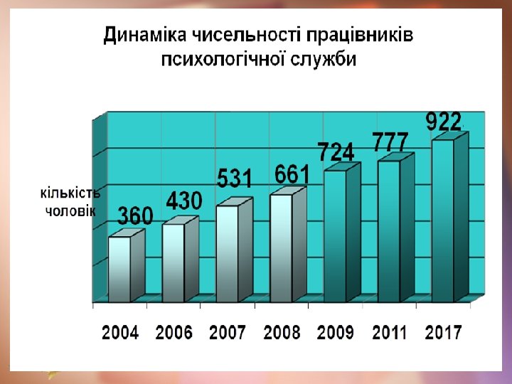 Сходинки професійного становлення працівника психологічної служби • Активна участь у методичній роботі. • Пізнання власних глибинних характеристик психіки через активне соціально-психологічне навчання. • Подолання внутрішніх опорів та бар'єрів, зниження відчуття тривоги, напруження на шляху досягнення професійних вершин через власну психокорекцію. • Позитивне ставлення до власних помилок як складової саморозвитку.