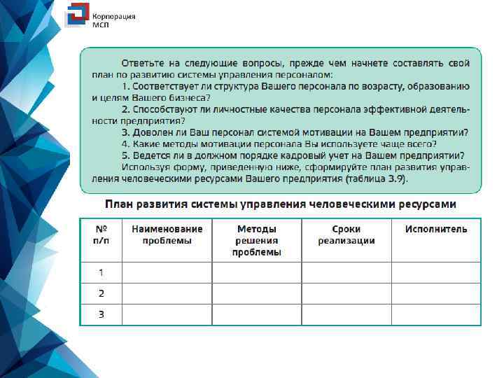 Укажите в плане: - С КАКИМИ трудностями Вы сталкиваетесь в области управления человеческими ресурсами? - КАК можно разрешить каждую из проблем? - КТО разрешит каждую из проблем? Вы или кто-то еще? Исполнитель Вы планируете разрешить каждую проблему? КВАЛИФИЦИРОВАННЫЙ ПЕРСОНАЛ – ВАШЕ ПРЕИМУЩЕСТВО