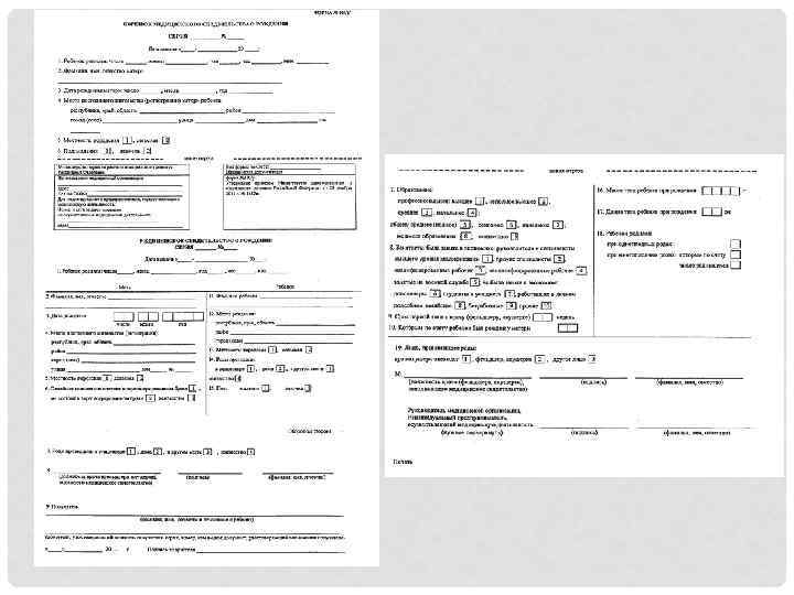 IV. Достоверность формы и содержания документов, выданных на территории иностранных государств В соответствии со статьями 14 и 64 ФЗ № 143 “Об актах гражданского состояния” основаниями для государственной регистрации рождения, смерти являются, в том числе и документы, установленной формы, выданные медицинской организацией. В РФ формы указанных документов установлены соответствующими постановлениями Правительства России. Имеют место случаи, когда в органы ЗАГС Тверской области обращаются граждане по вопросам государственной регистрации рождения либо смерти, предъявляя при этом в качестве оснований медицинские документы о рождении либо смерти, выданные на территории иностранных государств. Принимая во внимание положения пункта 1 статья 7 ФЗ и статьи 166 СК РФ, мы полагаем, что принятии решения о государственной регистрации рождения или смерти в каждой конкретной ситуации остаются вопросы, а именно. Возможно ли производство государственной регистрации рождения либо смерти на основании таких документов, которые зачастую не содержат всех тех сведений, которые по Федеральному закону необходимо внести в запись акта (статьи 22, 67). При этом органы ЗАГС не располагают достоверными сведениями о существовании какой-то конкретной районной больницы, родильного дома, о фамилиях работающих там врачей, уполномоченных выдавать такие документы.