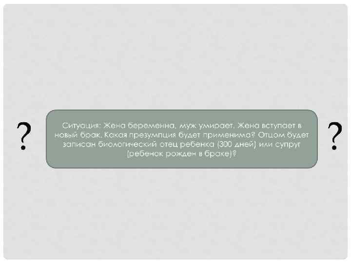 Коллизия презумпции отцовства q Если ребенок родился от лиц, состоящих в браке между собой, а также в течение трехсот дней с момента расторжения брака, признания его недействительным или с момента смерти супруга матери ребенка, отцом ребенка признается супруг (бывший супруг) матери, если не доказано иное (статья 52 настоящего Кодекса). Отцовство супруга матери ребенка удостоверяется записью об их браке (п. 2 ст. 48 СК РФ) q Запись родителей в книге записей рождений, произведенная в соответствии с пунктами 1 и 2 статьи 51 настоящего Кодекса, может быть оспорена только в судебном порядке по требованию лица, записанного в качестве отца или матери ребенка, либо лица, фактически являющегося отцом или матерью ребенка, а также самого ребенка по достижении им совершеннолетия, опекуна (попечителя) ребенка, опекуна родителя, признанного судом недееспособным. (п. 1 ст. 52 СК РФ)