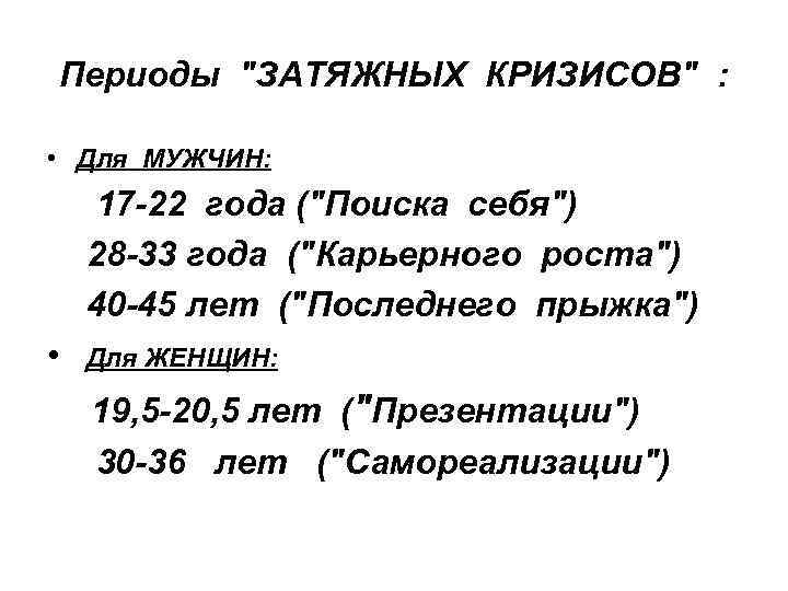 Периоды "ЗАТЯЖНЫХ КРИЗИСОВ" : • Для МУЖЧИН: 17 -22 года ("Поиска себя") 28 -33 года ("Карьерного роста") 40 -45 лет ("Последнего прыжка") • Для ЖЕНЩИН: 19, 5 -20, 5 лет ("Презентации") 30 -36 лет ("Самореализации")