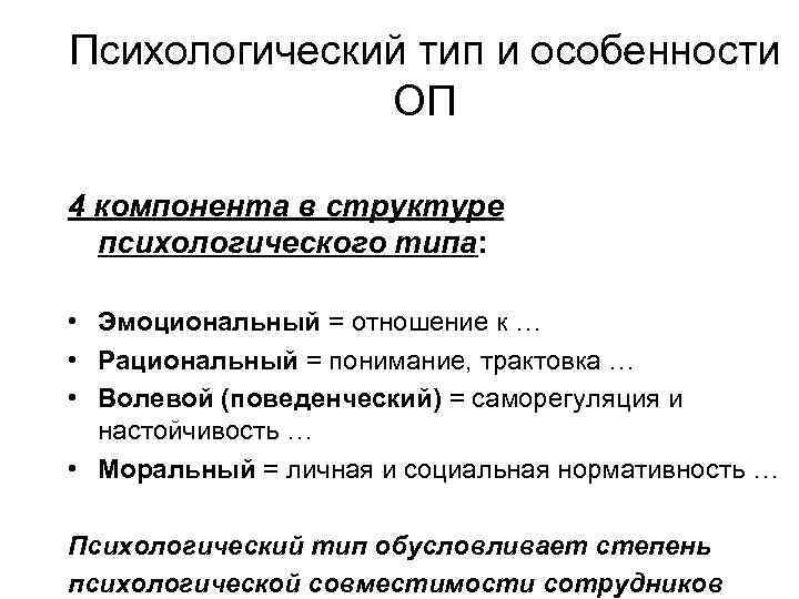 Психологический тип и особенности ОП 4 компонента в структуре психологического типа: • Эмоциональный = отношение к … • Рациональный = понимание, трактовка … • Волевой (поведенческий) = саморегуляция и настойчивость … • Моральный = личная и социальная нормативность … Психологический тип обусловливает степень психологической совместимости сотрудников