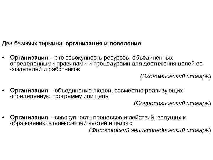 Два базовых термина: организация и поведение • Организация – это совокупность ресурсов, объединенных определенными правилами и процедурами для достижения целей ее создателей и работников (Экономический словарь) • Организация – объединение людей, совместно реализующих определенную программу или цель (Социологический словарь) • Организация – совокупность процессов и действий, ведущих к образованию взаимосвязей частей и целого (Философский энциклопедический словарь)