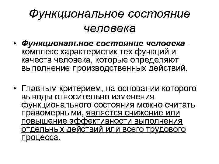 Функциональное состояние человека • Функциональное состояние человека - комплекс характеристик тех функций и качеств человека, которые определяют выполнение производственных действий. • Главным критерием, на основании которого выводы относительно изменения функционального состояния можно считать правомерными, является снижение или повышение эффективности выполнения отдельных действий или всего трудового процесса.