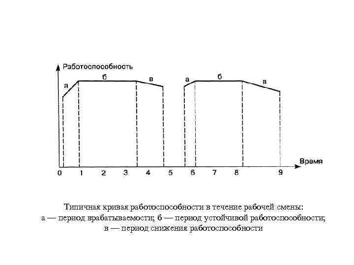 Типичная кривая работоспособности в течение рабочей смены: а — период врабатываемости; б — период устойчивой работоспособности; в — период снижения работоспособности