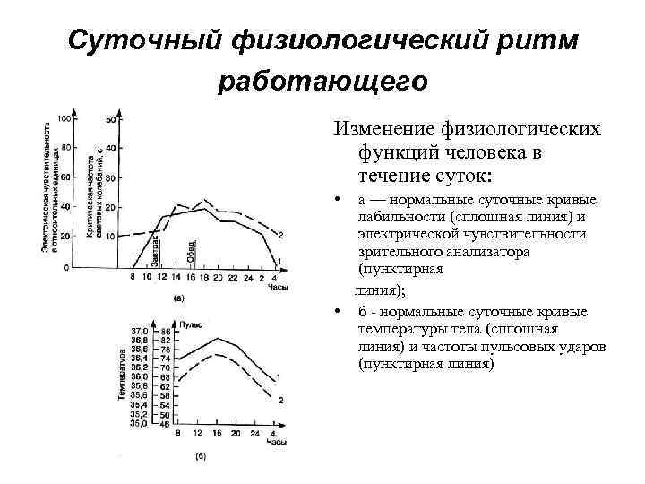 Суточный физиологический ритм работающего Изменение физиологических функций человека в течение суток: • а — нормальные суточные кривые лабильности (сплошная линия) и электрической чувствительности зрительного анализатора (пунктирная линия); • б - нормальные суточные кривые температуры тела (сплошная линия) и частоты пульсовых ударов (пунктирная линия)
