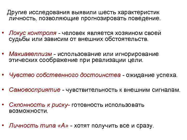 Другие исследования выявили шесть характеристик личность, позволяющие прогнозировать поведение. • Локус контроля - человек является хозяином своей судьбы или зависим от внешних обстоятельств. • Макиавеллизм - использование или игнорирование этических соображение при реализации цели. • Чувство собственного достоинства - ожидание успеха. • Самовосприятие - чувствительность к внешним сигналам. • Склонность к риску- готовность использовать возможности. • Личность типа «А» - хотят получить все и сразу.
