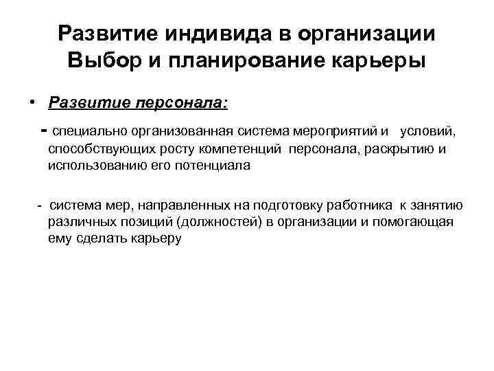 Развитие индивида в организации Выбор и планирование карьеры • Развитие персонала: - специально организованная система мероприятий и условий, способствующих росту компетенций персонала, раскрытию и использованию его потенциала - система мер, направленных на подготовку работника к занятию различных позиций (должностей) в организации и помогающая ему сделать карьеру