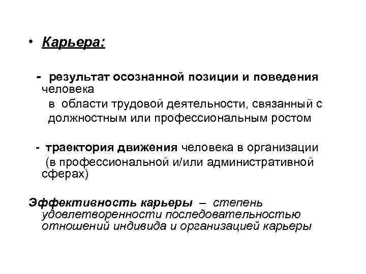 • Карьера: - результат осознанной позиции и поведения человека в области трудовой деятельности, связанный с должностным или профессиональным ростом - траектория движения человека в организации (в профессиональной и/или административной сферах) Эффективность карьеры – степень удовлетворенности последовательностью отношений индивида и организацией карьеры