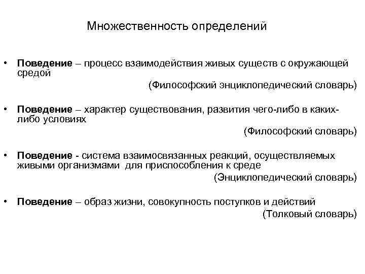 Множественность определений • Поведение – процесс взаимодействия живых существ с окружающей средой (Философский энциклопедический словарь) • Поведение – характер существования, развития чего-либо в каких- либо условиях (Философский словарь) • Поведение - система взаимосвязанных реакций, осуществляемых живыми организмами для приспособления к среде (Энциклопедический словарь) • Поведение – образ жизни, совокупность поступков и действий (Толковый словарь)