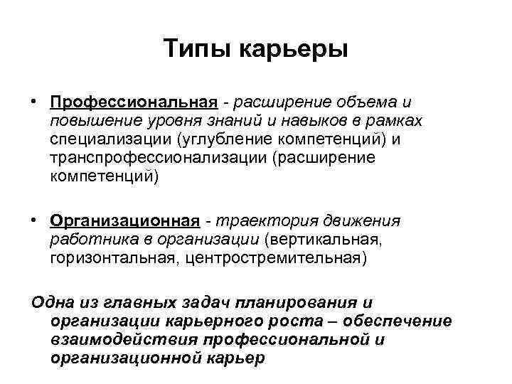 Типы карьеры • Профессиональная - расширение объема и повышение уровня знаний и навыков в рамках специализации (углубление компетенций) и транспрофессионализации (расширение компетенций) • Организационная - траектория движения работника в организации (вертикальная, горизонтальная, центростремительная) Одна из главных задач планирования и организации карьерного роста – обеспечение взаимодействия профессиональной и организационной карьер