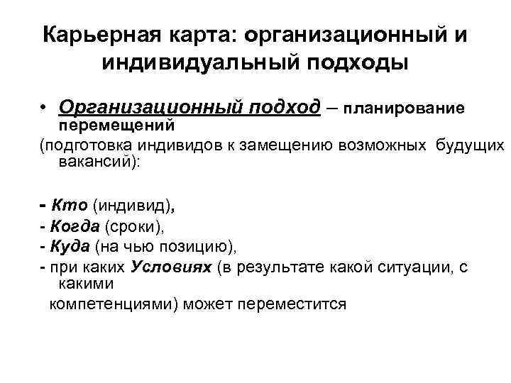 Карьерная карта: организационный и индивидуальный подходы • Организационный подход – планирование перемещений (подготовка индивидов к замещению возможных будущих вакансий): - Кто (индивид), - Когда (сроки), - Куда (на чью позицию), - при каких Условиях (в результате какой ситуации, с какими компетенциями) может переместится