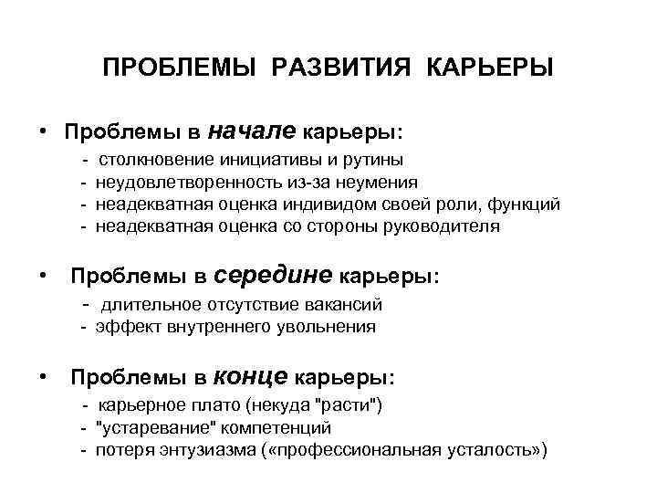 ПРОБЛЕМЫ РАЗВИТИЯ КАРЬЕРЫ • Проблемы в начале карьеры: - столкновение инициативы и рутины - неудовлетворенность из-за неумения - неадекватная оценка индивидом своей роли, функций - неадекватная оценка со стороны руководителя • Проблемы в середине карьеры: - длительное отсутствие вакансий - эффект внутреннего увольнения • Проблемы в конце карьеры: - карьерное плато (некуда "расти") - "устаревание" компетенций - потеря энтузиазма ( «профессиональная усталость» )