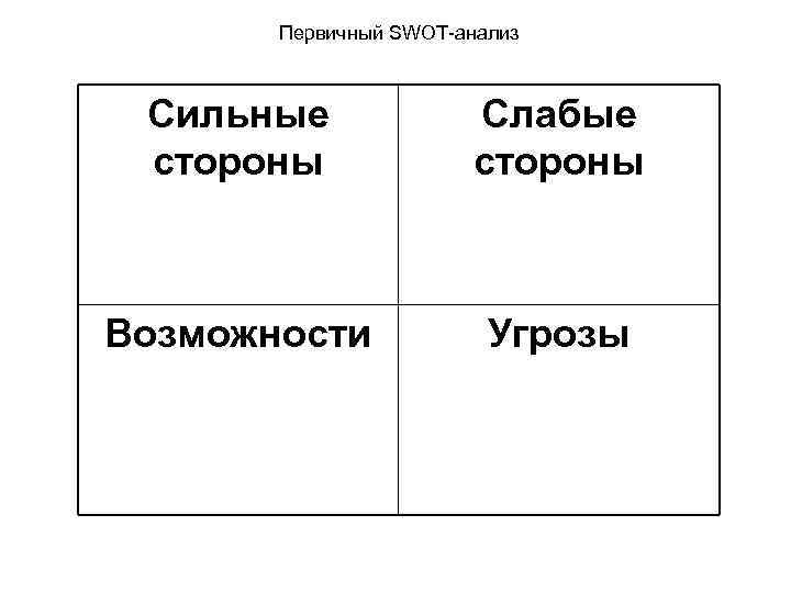 Первичный SWOT-анализ Сильные Слабые стороны Возможности Угрозы