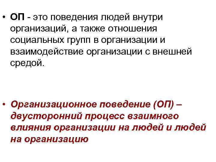 • ОП - это поведения людей внутри организаций, а также отношения социальных групп в организации и взаимодействие организации с внешней средой. • Организационное поведение (ОП) – двусторонний процесс взаимного влияния организации на людей и людей на организацию