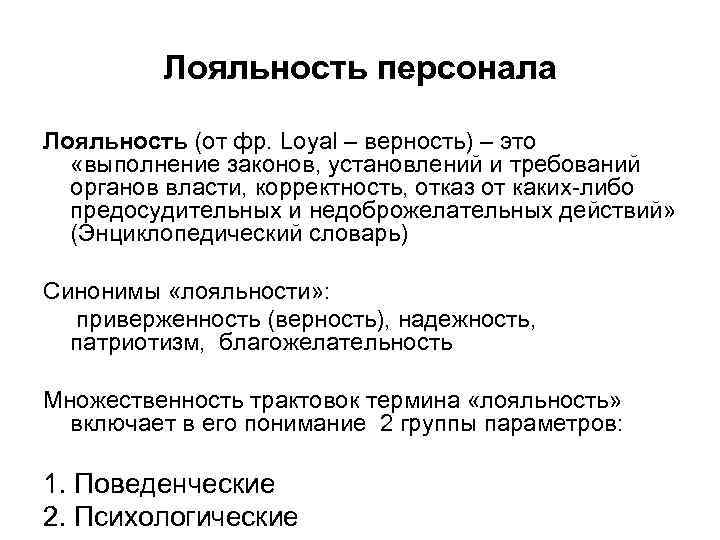 Лояльность персонала Лояльность (от фр. Loyal – верность) – это «выполнение законов, установлений и требований органов власти, корректность, отказ от каких-либо предосудительных и недоброжелательных действий» (Энциклопедический словарь) Синонимы «лояльности» : приверженность (верность), надежность, патриотизм, благожелательность Множественность трактовок термина «лояльность» включает в его понимание 2 группы параметров: 1. Поведенческие 2. Психологические