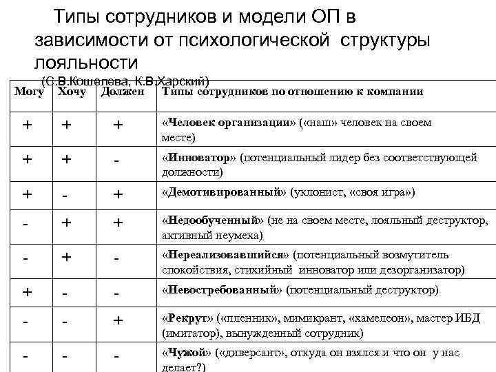 Типы сотрудников и модели ОП в зависимости от психологической структуры лояльности (С. В. Кошелева, К. В. Харский) Могу Хочу Должен Типы сотрудников по отношению к компании + + + «Человек организации» ( «наш» человек на своем месте) + + - «Инноватор» (потенциальный лидер без соответствующей должности) + - + «Демотивированный» (уклонист, «своя игра» ) - + + «Недообученный» (не на своем месте, лояльный деструктор, активный неумеха) - + - «Нереализовавшийся» (потенциальный возмутитель спокойствия, стихийный инноватор или дезорганизатор) + - - «Невостребованный» (потенциальный деструктор) - - + «Рекрут» ( «пленник» , мимикрант, «хамелеон» , мастер ИБД (имитатор), вынужденный сотрудник) - - - «Чужой» ( «диверсант» , откуда он взялся и что он у нас делает? )