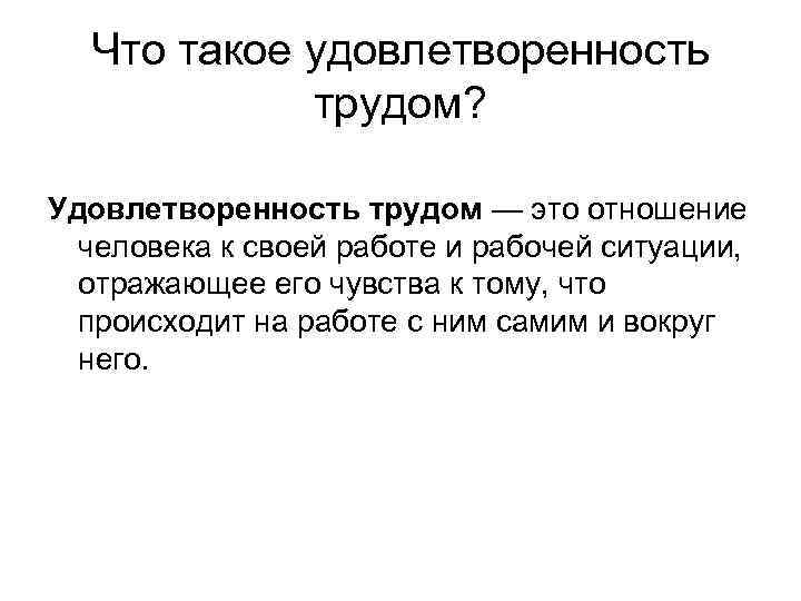 Что такое удовлетворенность трудом? Удовлетворенность трудом — это отношение человека к своей работе и рабочей ситуации, отражающее его чувства к тому, что происходит на работе с ним самим и вокруг него.