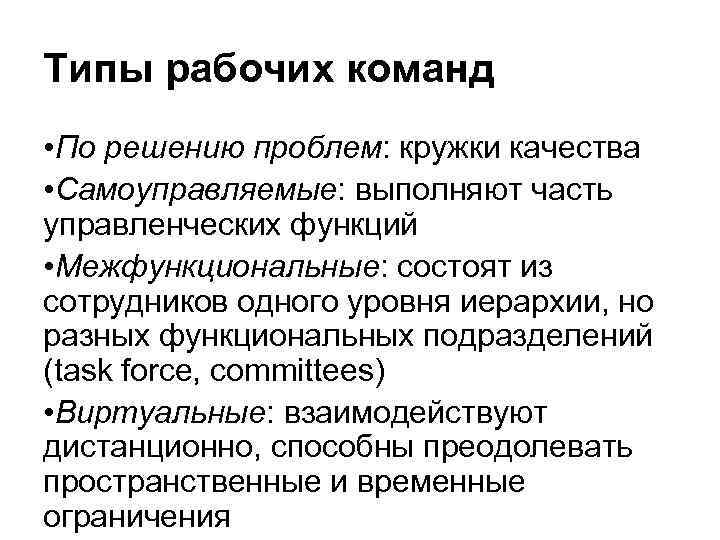 Типы рабочих команд • По решению проблем: кружки качества • Самоуправляемые: выполняют часть управленческих функций • Межфункциональные: состоят из сотрудников одного уровня иерархии, но разных функциональных подразделений (task force, committees) • Виртуальные: взаимодействуют дистанционно, способны преодолевать пространственные и временные ограничения