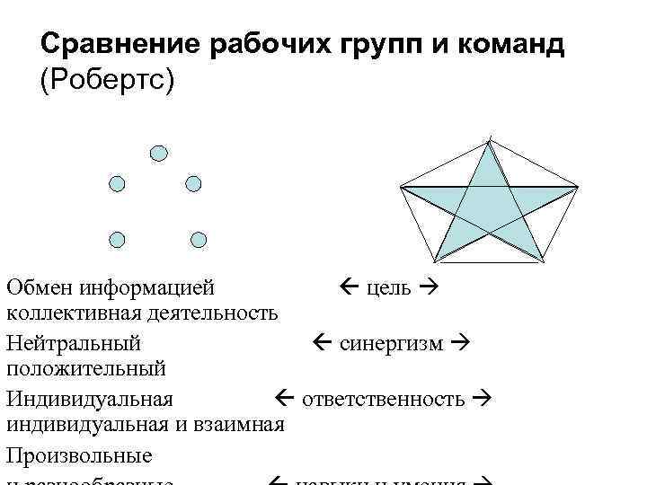 Сравнение рабочих групп и команд (Робертс) Обмен информацией цель коллективная деятельность Нейтральный синергизм положительный Индивидуальная ответственность индивидуальная и взаимная Произвольные