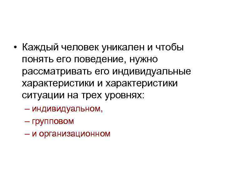 • Каждый человек уникален и чтобы понять его поведение, нужно рассматривать его индивидуальные характеристики и характеристики ситуации на трех уровнях: – индивидуальном, – групповом – и организационном