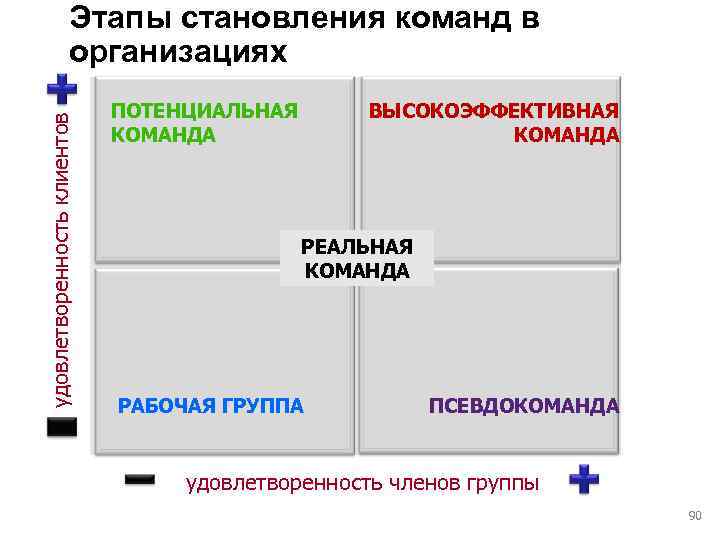 Этапы становления команд в организациях ПОТЕНЦИАЛЬНАЯ ВЫСОКОЭФФЕКТИВНАЯ удовлетворенность клиентов КОМАНДА РЕАЛЬНАЯ КОМАНДА РАБОЧАЯ ГРУППА ПСЕВДОКОМАНДА удовлетворенность членов группы 90