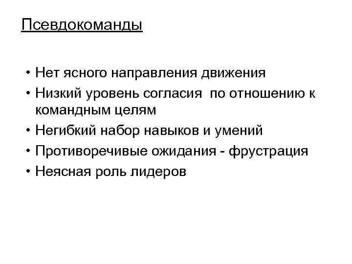 Псевдокоманды • Нет ясного направления движения • Низкий уровень согласия по отношению к командным целям • Негибкий набор навыков и умений • Противоречивые ожидания - фрустрация • Неясная роль лидеров