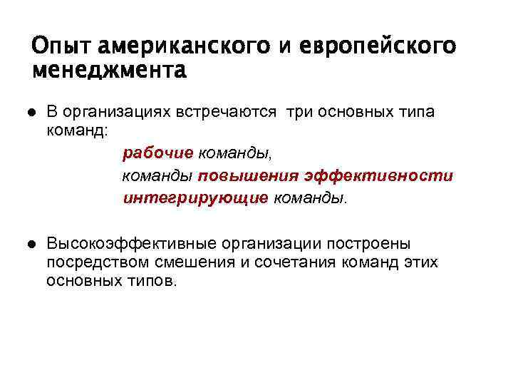 Опыт американского и европейского менеджмента l В организациях встречаются три основных типа команд: рабочие команды, команды повышения эффективности интегрирующие команды. l Высокоэффективные организации построены посредством смешения и сочетания команд этих основных типов.