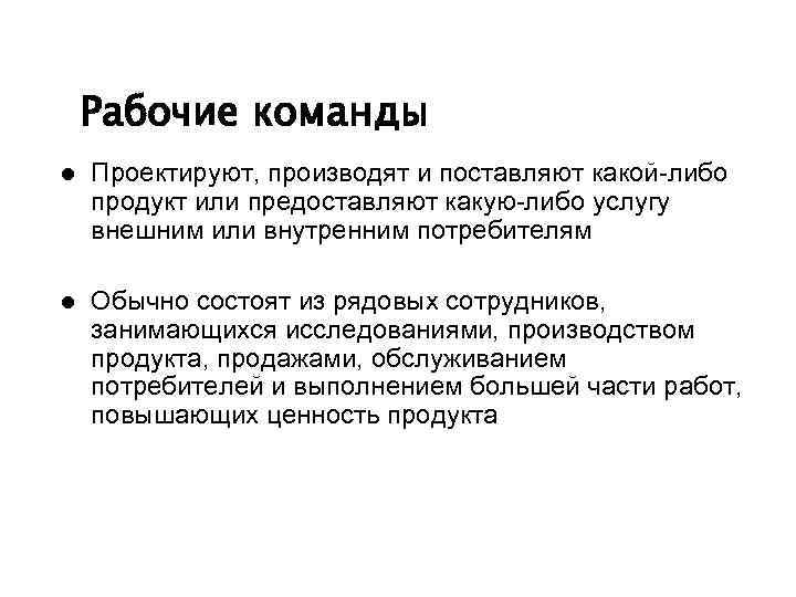 Рабочие команды l Проектируют, производят и поставляют какой-либо продукт или предоставляют какую-либо услугу внешним или внутренним потребителям l Обычно состоят из рядовых сотрудников, занимающихся исследованиями, производством продукта, продажами, обслуживанием потребителей и выполнением большей части работ, повышающих ценность продукта