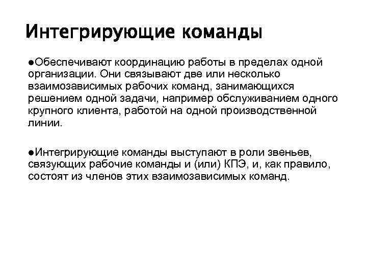 Интегрирующие команды l. Обеспечивают координацию работы в пределах одной организации. Они связывают две или несколько взаимозависимых рабочих команд, занимающихся решением одной задачи, например обслуживанием одного крупного клиента, работой на одной производственной линии. l. Интегрирующие команды выступают в роли звеньев, связующих рабочие команды и (или) КПЭ, и, как правило, состоят из членов этих взаимозависимых команд.