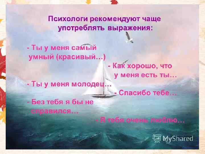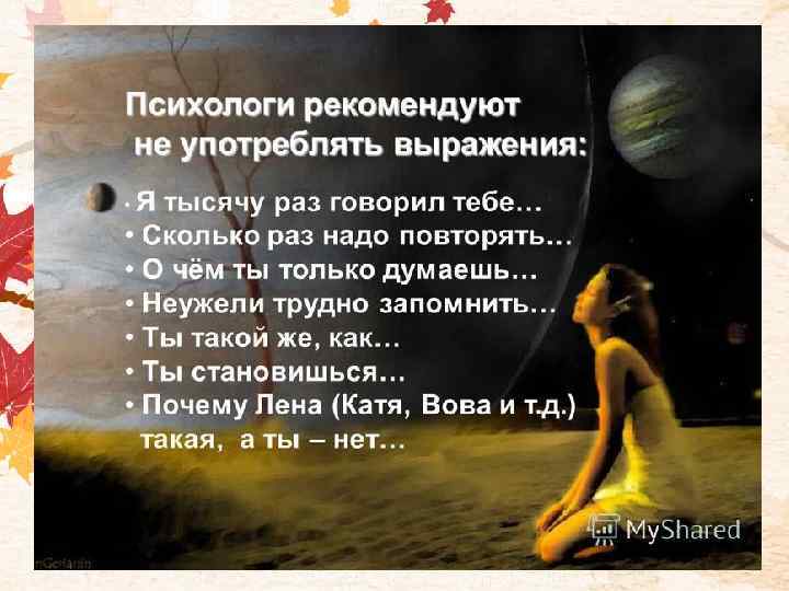 • ЗАПОМНИТЕ! Первые десять дней школьной жизни ребенка наказывать нельзя! • Старайтесь своего ребенка больше ХВАЛИТЬ! • Не скупитесь на похвалу, научитесь выделять в море ошибок островок успеха; • ПОМНИТЕ! Никогда не сравнивайте своего ребенка с другим! • Сравнивать ребенка можно только с ним самим и хвалить только за одно: улучшение его собственных результатов.
