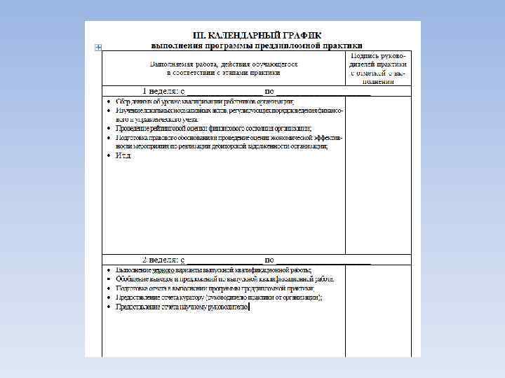 Последняя неделя производственной практики в соответствии с программой посвящена написанию отчета о ее выполнении. Таким образом, 24 апреля 2017 г. на кафедру экономической безопасности, анализа и статистики должны быть предоставлены следующие документы: • отчет о выполнении программы производственной практики; • дневник прохождения практики; • характеристику (аттестационный лист) по практике. Все вышеназванные документы д. б. подписаны руководителем практики от организации и иметь печать организации.