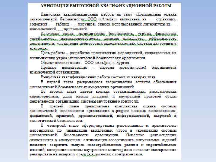 Аннотация выпускной квалификационной работы содержит все требуемые элементы. Содержание аннотации, а также обобщённых результатов исследования в основном соответствуют плану выпускной квалификационной работы, утвержденный руководителем преддипломной практик. Представленные результаты выполнения индивидуального задания в отдельных аспектах не отражают выполнение задач исследования и достижение цели исследования: Проведен поверхностный анализ факторов внутренней и внешней среды объекта исследования, способных стать источниками угроз экономической безопасности на основании официальной публикуемой отчетности, а также с применением данных Удовлетворительно внешних источников информации. Дана в общих чертах характеристика деятельности (В целом системы экономической безопасности, внутреннего контроля и аудита и проведенных соответствует) контрольных мероприятий. Автором применены стандартные методики экономического анализа и прогнозирования показателей экономической безопасности организации, территории при наличии расчетных ошибок и неточностей. Автор не представил четкого экономического обоснования компенсационных резервов, параметров инвестиционных проектов, иных мероприятий по обеспечению безопасности, чёткого обоснования ожидаемого экономического, социального и организационного эффекта от реализации предложенных мер по укреплению системы безопасности, устойчивости и повышению эффективности деятельности субъекта. В оформлении отчета имеются несущественные отклонения от предъявляемых требований. Пороговый Аннотация выпускной квалификационной работы не содержит всех требуемых элементов. Содержание глав не соответствует плану выпускной квалификационной работы, утвержденному руководителем преддипломной практики. Представленные результаты выполнения индивидуального задания не отражают выполнение задач исследования и достижение цели исследования. Неудовлетворитель Имеются грубые ошибки в расчетах, искажающие и не дающие реальной оценки угроз но безопасности субъекта. (Не соответствует) Предлагаемые мероприятия по укреплению системы безопасности не соответствуют условиям внешней и внутренней среды функционирования субъекта. Предложения и рекомендации носят общий характер, которые недостаточно аргументированы. Оформление отчета не соответствует предъявляемым требованиям. Компетенции не сформированы