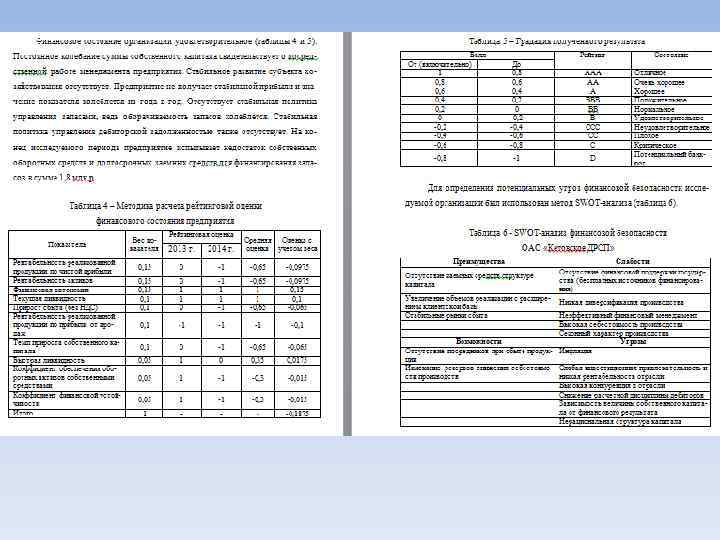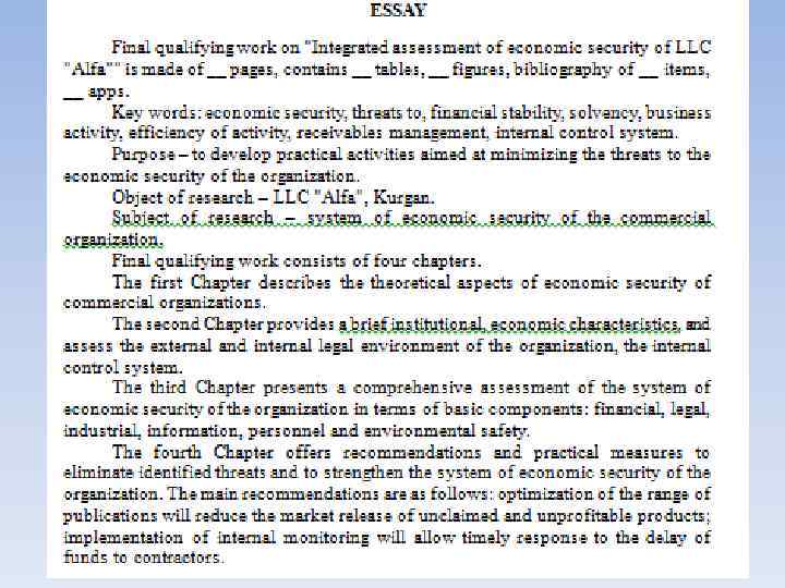 Второй раздел – результатов выполнения индивидуального задания по теме выпускной квалификационной работы. Содержит: • основные положения, характеризующие размер исследуемого предприятия или масштабы деятельности исполнительного органа власти, • наиболее существенные выводы, сформулированные по результатам выполнения индивидуального задания в соответствии с темой выпускной квалификационной работы. • краткое содержание предлагаемых автором мероприятий, направленных на укрепление безопасности, устойчивости организации, повышение эффективности деятельности правоохранительных и контрольно-ревизионных органов. Объем текстовой части доклада не должен превышать 4 страниц, количество таблиц и рисунков – не менее 8 и не более 15 ед. Общий объем 2 раздела не должен превышать 15 страниц.