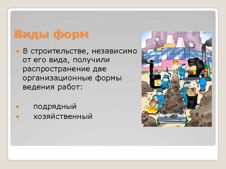 Виды форм В строительстве, независимо от его вида, получили распространение две организационные формы ведения работ: подрядный хозяйственный