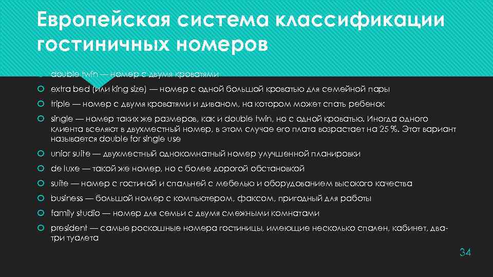Европейская система классификации гостиничных номеров double twin — номер с двумя кроватями extra bed (или king size) — номер с одной большой кроватью для семейной пары triple — номер с двумя кроватями и диваном, на котором может спать ребенок single — номер таких же размеров, как и double twin, но с одной кроватью. Иногда одного клиента вселяют в двухместный номер, в этом случае его плата возрастает на 25 %. Этот вариант называется double for single use unior suite — двухместный однокомнатный номер улучшенной планировки de luxe — такой же номер, но с более дорогой обстановкой suite — номер с гостиной и спальней с мебелью и оборудованием высокого качества business — большой номер с компьютером, факсом, пригодный для работы family studio — номер для семьи с двумя смежными комнатами president — самые роскошные номера гостиницы, имеющие несколько спален, кабинет, дватри туалета 34