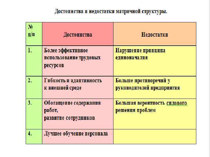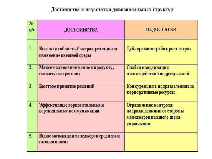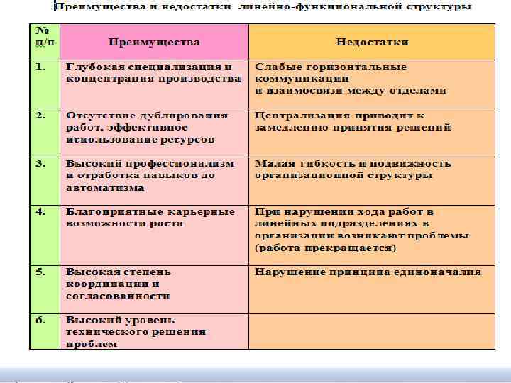 Достоинства линейной структуры: • Простота и чёткость подчинения • Оперативность в принятии решений • Согласованность действий исполнителей • Полная ответственность руководителя за работу подразделения • Единоначалие Недостатки линейной структуры: • Информационная перегрузка руководителя • Выполнение руководителями подразделений широкого круга дополнительных функций (кадровых, учётных и т. д. ). • Высокие требования к руководителю.