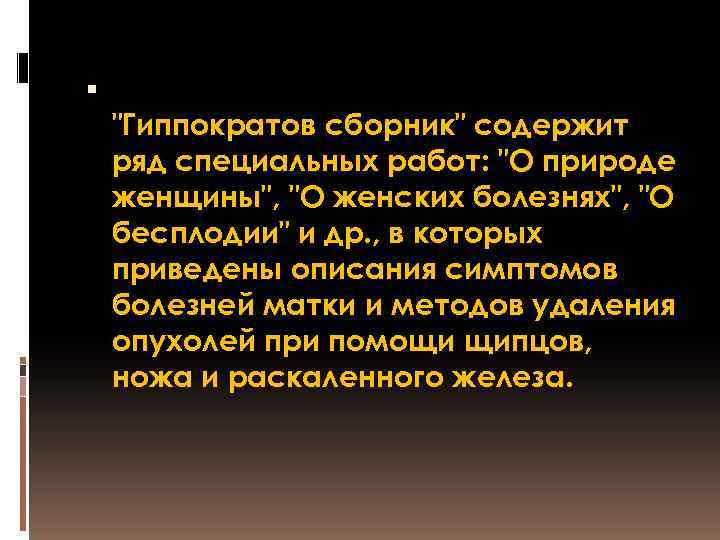 "Гиппократов сборник" содержит ряд специальных работ: "О природе женщины", "О женских болезнях", "О бесплодии" и др. , в которых приведены описания симптомов болезней матки и методов удаления опухолей при помощи щипцов, ножа и раскаленного железа.