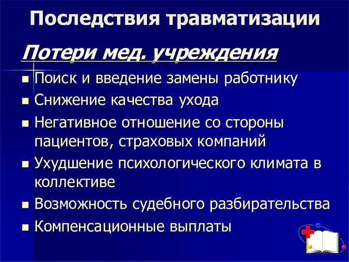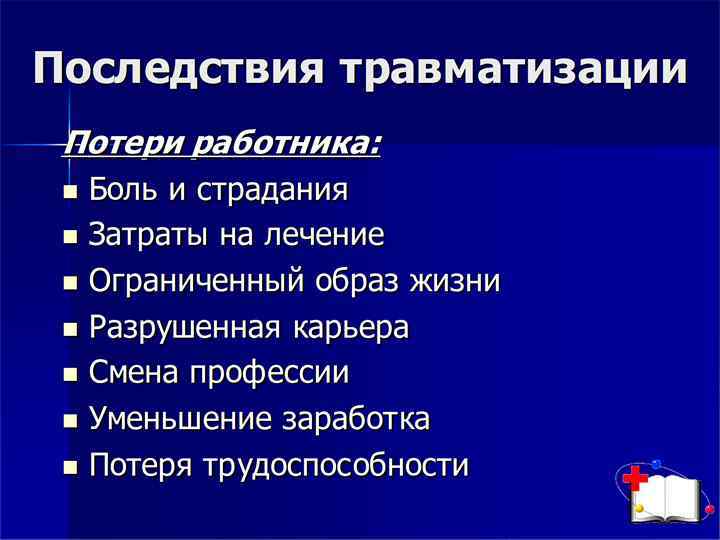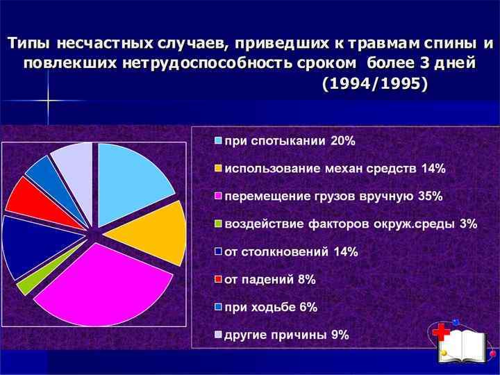 Факторы риска, вызывающие боль в спине и травму позвоночника Перегрузки: • членам бригады груз физически не по силам; • длительное нахождение груза в (на) руках; • слишком быстрое перемещение груза; • неэргономичное перемещение или подъем тя жести. Плохая эргономика: • недостаточно места при перемещении (теснота); • неправильный выбор высоты рабочего места; • большая или маленькая высота стула; • отсутствие или нехватка оснащения для пере мещения пациентов; • неудобная обувь. Неправильная поза: - наклоны вперед при перемещении тяжести; длительные (статические) наклоны вперед; разворот тела во время подъема; развороты тела, начиная с шейного, грудного отдела позвоночника. Плохое самочувствие: - общее физическое состояние, влияющее на само чувствие; ранняя (ускоренная) дегенерация суставов; ограниченная подвижность из за ожирения; преждевременное возвращение на работу после болезни; ослабленные (нетренированные) мышцы; депрессивное состояние. Травма: падение на влажной или скользкой поверхности пола.