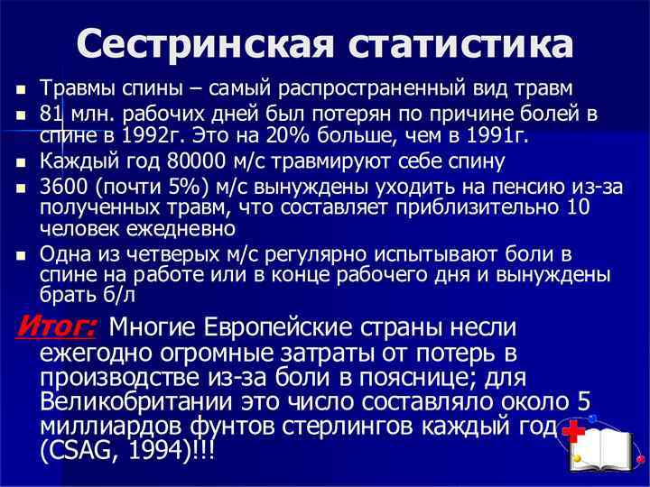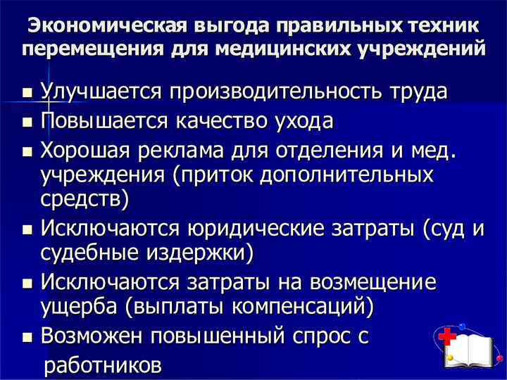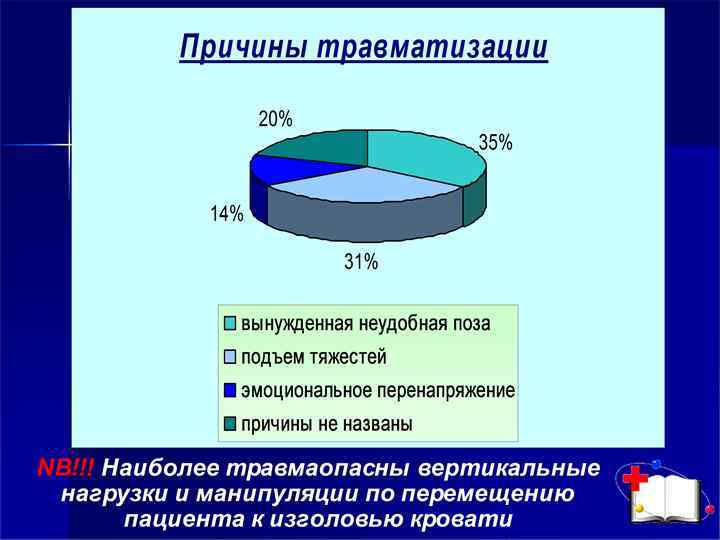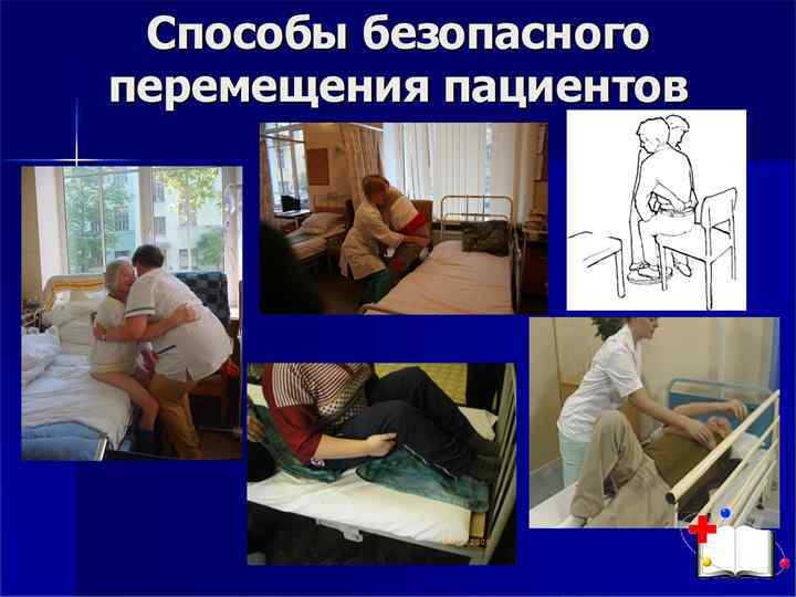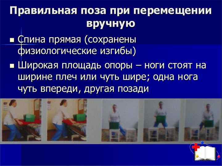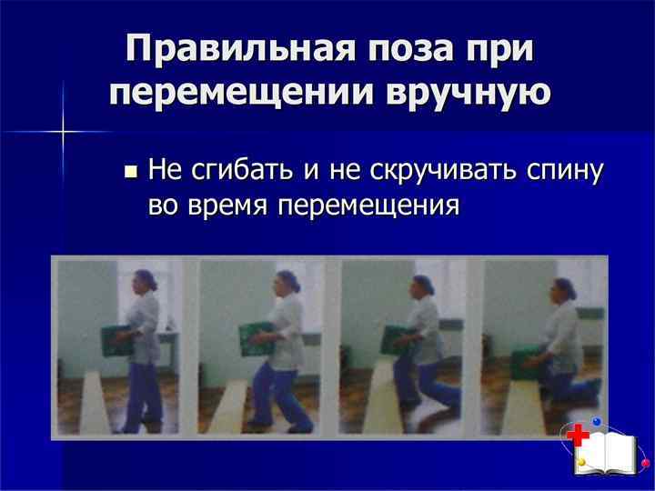 Профессиональная безопасность: Безопасность сестры на рабочем месте обеспечит комфорт в работе, снижение риска повреждений опорно двигательного аппарата (профилактику остеохондроза, остеопороза, болезней связок, суставов), опущение внутренних органов. Профессия медсестры уязвима также неблагоприятным влиянием физического фактора стационарной среды, связанным с: транспортировкой пациентов; перемещением тяжелобольных в постели; поднятием (передвижением) аппаратуры и оборудования. Специфика сестринской профессии — нагрузки и перегрузки в течение рабочего дня на опорно двигательный аппарат, преимущественно позвоночника, тазобедренных и коленных суставов. Величина физической нагрузки будет зависеть от положения тела.
