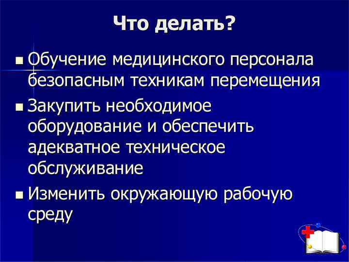 Индивидуальные возможности: • определить физические возможности людей, участвующих в перемещении больных; • провести тренировки; • подобрать группу в соответствии с поставленной задачей. Рабочая среда: • устранить факторы, мешающие перемещению в пространстве; • выяснить состояние пола в помещении; • избегать работы на полу, расположенному на разных уровнях; • контролировать температуру окружающей среды; • максимально улучшить оснащение. Груз должен быть максимально: • облегчен ( что обычно невозможно сделать с пациентами); • удобен для перемещения; • устойчив; • менее травмирующий; • доступен для обхвата руками. Эргономические факторы: • разделить задачу на части; • улучшить давно сложившейся порядок работы; • провести обучение по перемещению тяжести вручную в положении сидя и стоя; • обеспечить персонал индивидуальными средствами защиты; • использовать специальное оборудование; • организовать бригаду. Факторы, снижающие риск травматизма