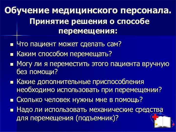 ПРИНЦИПЫ БЕЗОПАСНОГО ПЕРЕМЕЩЕНИЯ ВРУЧНУЮ Носите подходящую одежду и обувь. Перемещайте пациента вручную только в том случае, если у вас нет других вариантов. До начала перемещения оцените состояние пациента или объект перемещения. Всегда выбирайте оптимальный метод перемещения. До начала перемещения определите лидера группы. Все инструкции и пояснения как пациенту, так и ассистентам, должны исходить от лидера группы. Объясните смысл движения пациенту, которого необходимо переместить, и каждому ассистенту. Подготовьте площадку для перемещения. Поставьте оборудование на тормоз. Правильно поставьте ноги и ступни, создайте себе хорошую, устойчивую опору. Создайте себе устойчивую опору ступней и коленом, а если можно — рукой и кистью. Правильно ставьте ступни для того, чтобы уменьшить перекручивание (вращение) позвоночника.