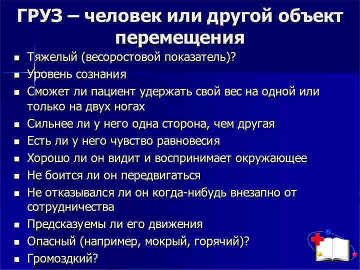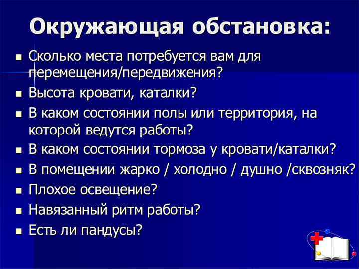 Факторы, влияющие на риск получения травм и болей в спине Индивидуальные возможности медсестер • физическое развитие; • специальные знания и тренировка; • состояние здоровья, беременность. Рабочая среда Факторы, мешающие перемещению в пространстве: • неровные, скользкие, неустойчивые полы; • полы или поверхности, расположенные на разных уровнях; • плохое освещение; • экстремальные вели чины температуры, влажности; • сквозняки. Груз • тяжелый; • громоздкий; • объемный; • потенциально опасный. Эргономические факторы: • расстояние между туловищем и грузом; развороты или наклоны туловища вперед; • избыточные расстояния, на которые поднимается, опускается или переносится груз; • избыточная сила толкания или тяги груза; • вероятность неожиданного движения; часто повторяющиеся или длительные физические усилия; • недостаточные периоды для отдыха и восстановления сил; • перемещение груза в положении сидя; • перемещение груза командой.