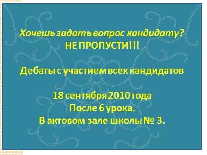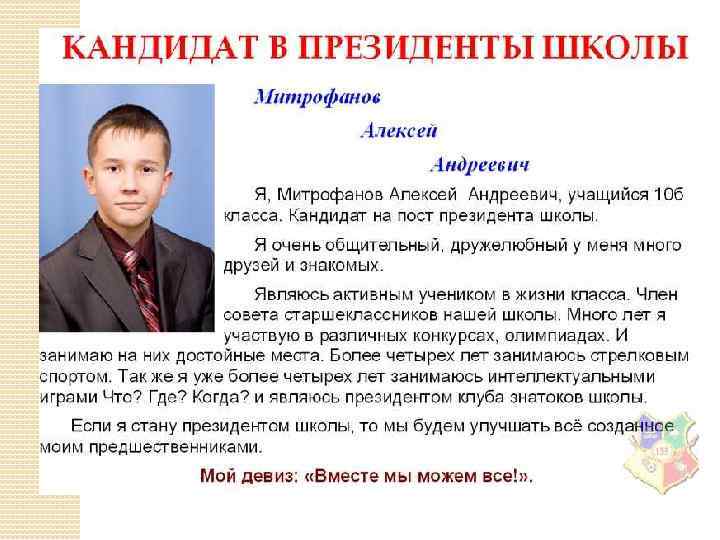 Бердыев Тагир Предвыборная программа Я считаю, что одной из главных задач является создание комфорта и уюта в школе. Именно это позволяет школе быть нашим вторым домом, но этого очень трудно добиться за короткий срок. Для этого необходимо привлечь большее число учеников к школьной жизни. Сейчас большинство ребят приходят в школу с чувством, что от них ничего не зависит, и я надеюсь это изменить. Школа - это не только место, где мы можем получать знания, но и заводить друзей, выражать себя. Поэтому я надеюсь развить школьный досуг: 1. Проводить большее число внеклассных мероприятий: вечеров, конкурсов, дискотек, чтобы заинтересовать большее число учащихся; 2. Создать различные кружки и клубы, где ученики могли бы развивать свои таланты, узнавать и открывать для себя что-то новое. Развить школьные СМИ: 1. Развитие печатного издания школы «Классная газета» . 2. Открытие Форумов на школьном сайте. 3. Создание школьной электронной почты, которая была бы связующим звеном между учениками и учителями, администрацией, Советом старшеклассников. Это помогло бы многим ученикам вносить свои предложения, а Совету старшеклассников узнать, о чём думают и что хотят школьники. Кроме этого необходимо изменить: 1. Увеличить время перемен для питания в столовой. 2. Развить взаимосвязь между старшими и младшими школьниками. 3. Обустроить уголки отдыха в коридорах школы. 4. Развить связь школы и профессиональных учебных заведений. 5. Устраивать компьютерные турниры по интеллектуальным играм. 6. Продолжение хорошей традиции озеленения территории: 7. Создание "Аллеи выпускников"; 8. Посадка цветов и деревьев на школьной территории (в летнее время); 9. Создание "зелёных" уголков в стенах родной школы (на зимний период).