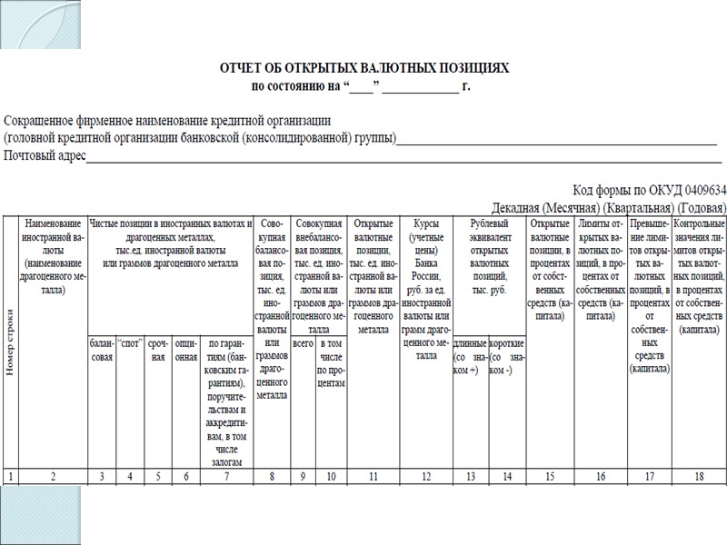 Кредитные организации составляют и представляют отчеты о размерах (лимитах) открытых валютных позиций по форме отчетности 0409634 «Отчет об открытых валютных позициях» (Указание ЦБ РФ № 2332-У)