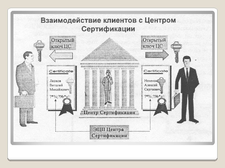 (2) Основные понятия § Сертификат ключа подписи - документ на бумажном носителе или электронный документ с электронной цифровой подписью уполномоченного лица удостоверяющего центра, которые включают в себя открытый ключ электронной цифровой подписи и которые выдаются удостоверяющим центром участнику информационной системы для подтверждения подлинности электронной цифровой подписи и идентификации владельца сертификата ключа подписи (Федеральный закон от 10. 01. 2002 № 1 -ФЗ «Об электронной цифровой подписи» ). § Владелец сертификата ключа подписи - физическое лицо, на имя которого удостоверяющим центром выдан сертификат ключа подписи и которое владеет соответствующим закрытым ключом электронной цифровой подписи, позволяющим с помощью средств электронной цифровой подписи создавать свою электронную цифровую подпись в электронных документах (подписывать электронные документы) (Федеральный закон от 10. 01. 2002 № 1 -ФЗ «Об электронной цифровой подписи» )