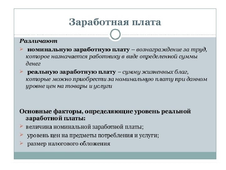 ПРИНЦИПЫ ОПЛАТЫ ТРУДА • • • Оплата в зависимости от количества и качества труда Дифференциация заработной платы в зависимости от квалификации, условий труда, отраслевой и региональной принадлежности Индексация заработной платы в соответствии с уровнем инфляции Материальное наказание за допущенный брак и безответственное отношение к своим обязанностям Стимулирование за качество труда и добросовестное отношение к труду Превышение темпов роста производительности труда над темпами роста средней заработной платы